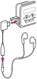 - Připojte ke konektoru USB/sluchátek ke svému IC rekordéru dodaná stereofonní sluchátka pomocí speciálního sluchátkového kabelu, který je také dodáván s IC rekordérem.