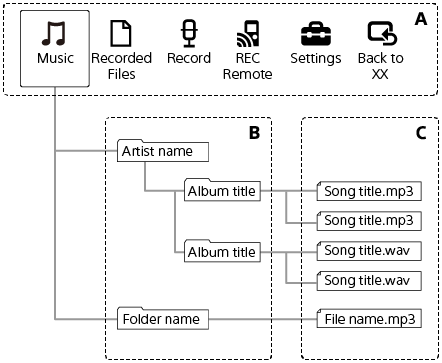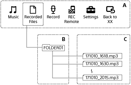 Segue-se a ilustração da estrutura de pastas e ficheiros que pode ver no gravador de IC.