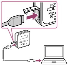 - Öppna luckan för USB-kontakt på sidan av IC-inspelare. Anslut USB-/ hörlurskontakt till en USB-port på en dator som är igång med medföljande USB-kabel.