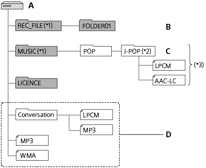 *2 包含音乐文件的文件夹与IC录音机上的文件夹名称相同。如果是用一种简单易记的方式命名的文件夹,这样将有助于识别文件夹。上图中所示的文件夹名仅为示例。