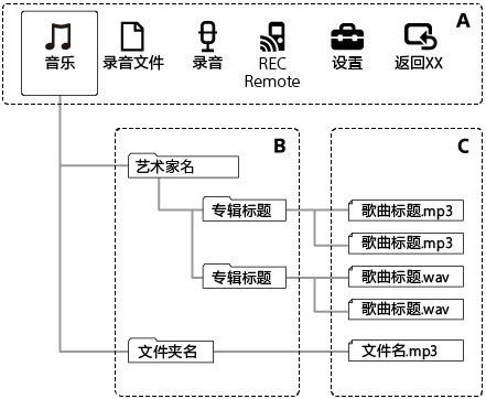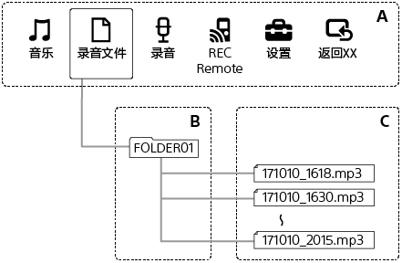 下图展示了IC录音机上的文件夹和文件结构。