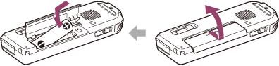 اسحب غطاء حجيرة البطارية وارفعه، وقم بإدخال بطارية NH-AAA قابلة للشحن (مرفقة مع ICD-UX533/UX533F/UX534F) أو بطارية قلوية نوع LR03 (قياس AAA) (مرفقة مع ICD-UX532) بقطبية صحيحة، ثم أغلق الغطاء.