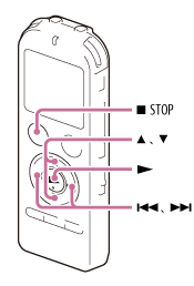 ,時鐘設定模式會被取消,視窗返回停止模式的顯示畫面。 - 時間會以12-Hour(搭配“AM”或“PM”)或 24-Hour顯示,端視選單中的“Time Display”設定而定。視購買IC錄音機的國家或地區而定,預設設定各有不同。