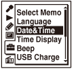 ,時鐘設定模式會被取消,視窗返回停止模式的顯示畫面。 - 時間會以12-Hour(搭配“AM”或“PM”)或 24-Hour顯示,端視選單中的“Time Display”設定而定。視購買IC錄音機的國家或地區而定,預設設定各有不同。