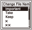 標籤中,選取您想重新命名的檔案。 - 在停止模式中,請選取MENU -