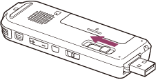 - Desligue o gravador de IC da porta USB do computador e deslize o botão deslizante USB DIRECT na direção da seta para recolher o conector USB.