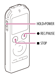 - Deslize o interruptor HOLD•POWER na direção de “POWER” para ligar o gravador de IC ou na direção do centro para libertar o estado HOLD do gravador de IC.