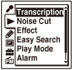 - Pode utilizar os seguintes itens de menu quando o gravador de IC estiver no modo de reprodução da transcrição.