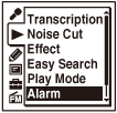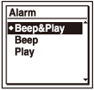 No dia e hora programados, o gravador de IC liga-se automaticamente e “ALARM” é apresentado no visor. De seguida, o alarme e o ficheiro selecionado serão reproduzidos utilizando o padrão de alarme selecionado. No final da reprodução, o gravador de IC para automaticamente. (Quando o padrão de alarme é programado para “Beep&Play” ou “Play”, o gravador de IC irá parar no início do ficheiro selecionado.)