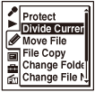 A animação “Dividing...” aparece no visor e os ficheiros divididos recebem como sufixo um número sequencial (“_1” para o ficheiro original e “_2” para o ficheiro novo).