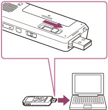 - Deslize o botão deslizante USB DIRECT na parte de trás do gravador de IC e insira o conector USB na porta USB de um computador em execução.
