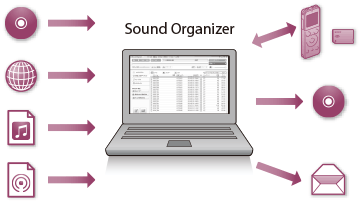 البرنامج Sound Organizer يتيح امكانية تبادل الملفات بين مسجل IC أو بطاقة الذاكرة. يمكن أيضًا تشغيل ونقل الأغاني المستوردة من أسطوانات CD الموسيقية والوسائط الأخرى، والملفات الصوتية MP3 والملفات الصوتية الأخرى المستوردة من الكمبيوتر، وملفات بودكاست إلى مسجل IC. يمكن تنفيذ عمليات مختلفة على الملفات المستوردة، بما في ذلك الاستماع والتحرير والتحويل إلى صيغة MP3 وصيغ أخرى. كما يمكن نسخ الموسيقى التي تحبها إلى أسطوانات CD، وارسال ملفات صوتية عبر البريد الإلكتروني.