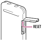 عند استمرار المشكلة بعد التأكد من الأفعال التصحيحية المدرجة في جداول «تحري الخلل وإصلاحه»، يمكن حل المشكلة بواسطة إعادة ضبط مسجل IC. اضغط الزر RESET بدبوس صغير، إلخ. إذا ضغطت الزر RESET أثناء تشغيل مسجل IC، قد يم حذف البيانات والتهيئات المخزنة. قبل إعادة الضبط، تأكد من عدم اضاءة مؤشر التشغيل (