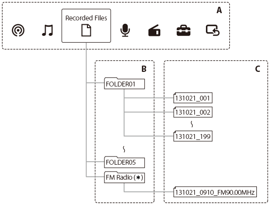 "FM Radio": Όταν εγγράφετε μια εκπομπή ραδιοφώνου FM, τα εγγεγραμμένα αρχεία αποθηκεύονται αυτόματα σε αυτό το φάκελο. (μόνο ICD-UX543F/UX544F)