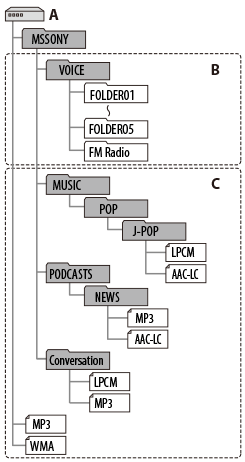 Recorded Files” of the IC recorder. When you transfer a file from your computer to the IC recorder, put the file in the folders under the VOICE folder.