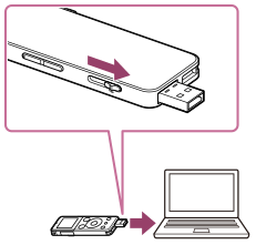 - Skjut USB-spaken på baksidan av IC-inspelaren och för in USB-ingången i USB-porten på en påslagen dator.