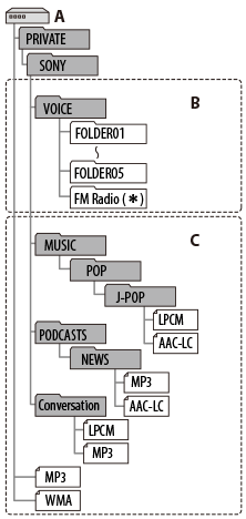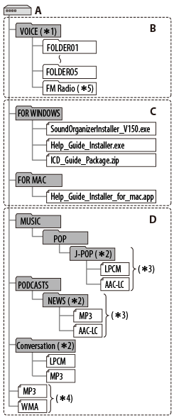 *1 Även om en fil överförs direkt under VOICE-mappen visas den inte i ”
