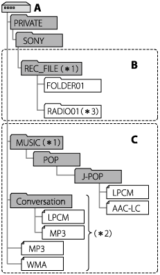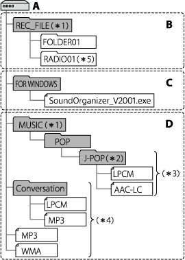 *2 Le dossier contenant les fichiers de musique porte le même nom sur votre enregistreur IC. Vous pouvez donner un nom plus descriptif pour identifier les dossiers. Les noms de dossier affichés dans l'illustration ci-dessous sont seulement des exemples.