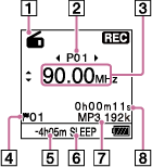 Segue-se a descrição do visor quando a gravação de transmissões de rádio FM está em curso.