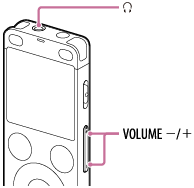 (auscultadores). - Prima VOLUME –/+ para ajustar o volume de controlo.Alterar o volume de controlo não afeta o volume de gravação.