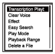 - Com a reprodução em suspensão, selecione “Transcription Playback Mode” no menu OPTION e, de seguida, prima