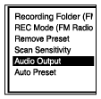 - Enquanto está a ouvir rádio FM ou a gravar transmissões de rádio FM, selecione “Audio Output” no menu OPTION e, de seguida, prima