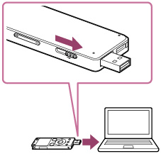 - Deslize o botão deslizante USB na parte posterior do gravador de IC na direção da seta para remover o conector USB e insira-o na porta USB de um computador que esteja em funcionamento.