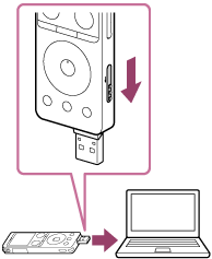 اسحب ذراع سحب USB في جانب مسجل IC لأسفل لإخراج موصل USB، وأدخله في منفذ USB في كمبيوتر يعمل.