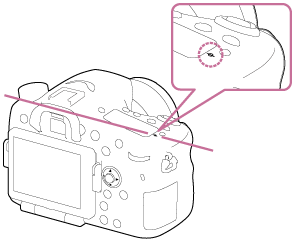 مکان حسگر تصویر* را نشان می دهد. هنگامی که فاصله دقیق بین محصول و سوژه را اندازه می گیرید، به موقعیت خط افقی رجوع کنید.
