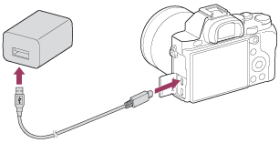 - Připojte fotoaparát s vloženým blokem akumulátorů k síťovému adaptéru (přiložen) kabelem mikro USB (přiložen) a připojte síťový adaptér do síťové zásuvky.