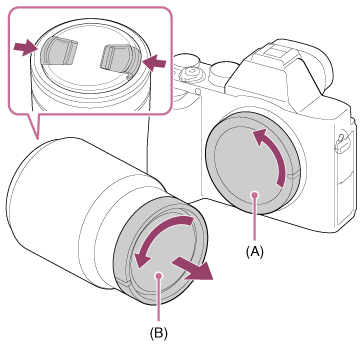 - Haal de lensvattingdop (A) van de camera af en haal de achterlensdop (B) van de achterkant van de lens af.