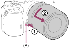 - Houd de lensontgrendelingsknop (A) ingedrukt en draai de lens in de richting van de pijl tot hij stopt.
