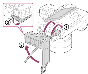 ใช้ตัวป้องกันสายเพื่อป้องกันไม่ให้สาย HDMI หลุดจากตัวกล้องขณะถ่ายภาพ ยกจอภาพขึ้นและเสียบสาย HDMI จากนั้นเสียบตัวป้องกันสายดังในภาพ
