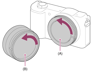 - درپوش بدنه (A) را از دوربین و درپوش پشت لنز (B) را از پشت لنز بردارید.