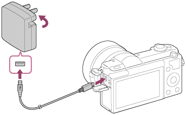 - Kytke kamera akkuineen verkkolaitteeseen (mukana) micro USB -kaapelilla (mukana) ja kytke sitten verkkolaite pistorasiaan.