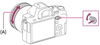 เปลี่ยนเป็นโหมดโฟกัสด้วยตัวเองชั่วคราว ปรับโฟกัสโดยหมุนวงแหวนปรับโฟกัส (A) พร้อมกับกดปุ่ม AF/MF ค้างไว้