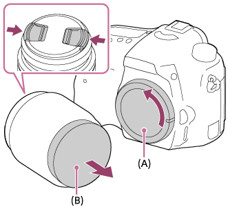Z fotoaparátu sundejte kryt otvoru pro objektiv (A) a ze zadní strany objektivu sundejte obal (B).