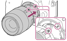 - Objektiv lehce zasunujte do fotoaparátu a přitom ho pomalu otáčejte ve směru šipky, dokud nezaklapne do uzamčené polohy.