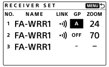 Наведіть курсор на пункт GP (група) або ZOOM (кут охоплення спалаху) потрібного бездротового радіоприймача, натискаючи верхній/нижній/правий/лівий край диска керування, а тоді натисніть центральну кнопку.