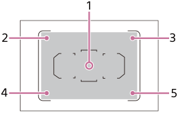 Voit säätää automaattitarkennuspistettä objektiivin laajakulma- ja telepäässä. Kun Hybrid Phase Detection AF on aktiivinen*, voidaan säätää sekä kulma-alueiden (2–5) että keskialueen (1) automaattitarkennuspisteitä.