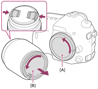 - Ta kamerahusdekselet (A) av kameraet, og det bakre objektivdekselet (B) av baksiden av objektivet.