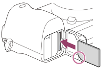 - Indsæt hukommelseskortet med det afskårne hjørne vendt i den viste retning, indtil det klikker på plads. Indsæt hukommelseskortet korrekt. Gør du ikke det, kan det forårsage en fejlfunktion.