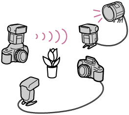 Du kan tilslutte en anden blitzenhed eller kamera til denne blitzenhed med synkroniseringsledningen (medfølger ikke) for at udføre synkroniseret blitzfotografering som beskrevet nedenfor.