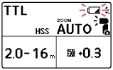 (overophedningsindikator) lyse på LCD-panelet for at angive, at blitzaffyring er deaktiveret i et stykke tid. I sådan et tilfælde skal du slukke på tænd/sluk-kontakten på blitzenheden og lade enheden være ubenyttet i ca. 20 minutter, så den får lov til at køle af. -