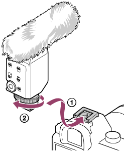 Door dit toestel op een camera te bevestigen, wordt de audio-ingang automatisch overgeschakeld van de ingebouwde microfoon naar de externe microfoon (dit toestel). Wanneer het moeilijk is om de Multi-interfacevoet in de schoen te steken, moet u de vergrendelingsknop tegen de klok in draaien tot deze stopt en het dan opnieuw proberen.