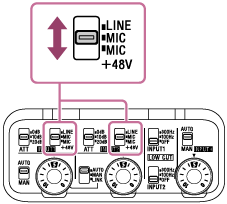 Afhængigt af den enhed som er tilsluttet til INPUT1- eller INPUT2-jackstikket, skal du indstille INPUT1 (LINE/MIC/MIC+48V)- eller INPUT2 (LINE/MIC/MIC+48V)-kontakten som følger: