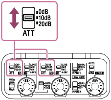 Når INPUT1 (LINE/MIC/MIC+48V)- eller INPUT2 (LINE/MIC/MIC+48V)-kontakten er indstillet til enten "MIC" eller "MIC+48V", kan du indstille standardindgangsniveauet med ATT (INPUT1)- eller ATT (INPUT2)-kontakten. Vælg det passende niveau for følsomheden for den tilsluttede mikrofon eller for lydstyrkeniveauet for indgangslyden.