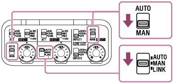 Als u de AUTO/MAN (INPUT1) schakelaar op "MAN" zet en de AUTO/MAN/LINK (INPUT2) schakelaar op "LINK" zal de AUDIO LEVEL knop voor de INPUT2-aansluiting niet meer werken. Op deze manier kunt u de volumeniveaus voor de opname van de audiosignalen die binnenkomen via INPUT1 en INPUT2 tegelijkertijd regelen met de AUDIO LEVEL knop voor de INPUT1-aansluiting.