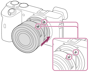 - Mens du forsigtigt skubber objektivet mod kameraet, skal du dreje objektivet langsomt i pilens retning, indtil det klikker på plads i den låste position.
