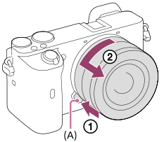 Fortsæt med at trykke på objektivfrigørelsesknappen (A) og drej objektivet i pilens retning, indtil det stopper.